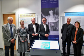 Landtagspräsident Hendrik Hering (3.v.r.), Direktor Bernhard Kukatzi (3.v.l.), (rechts) Ausstellungskurator Torsten Israel und Generalkonsulin Ioanna Kriebardi, (links) Uwe Bader, Marita Hoffmann (Ausstellungsteam) .