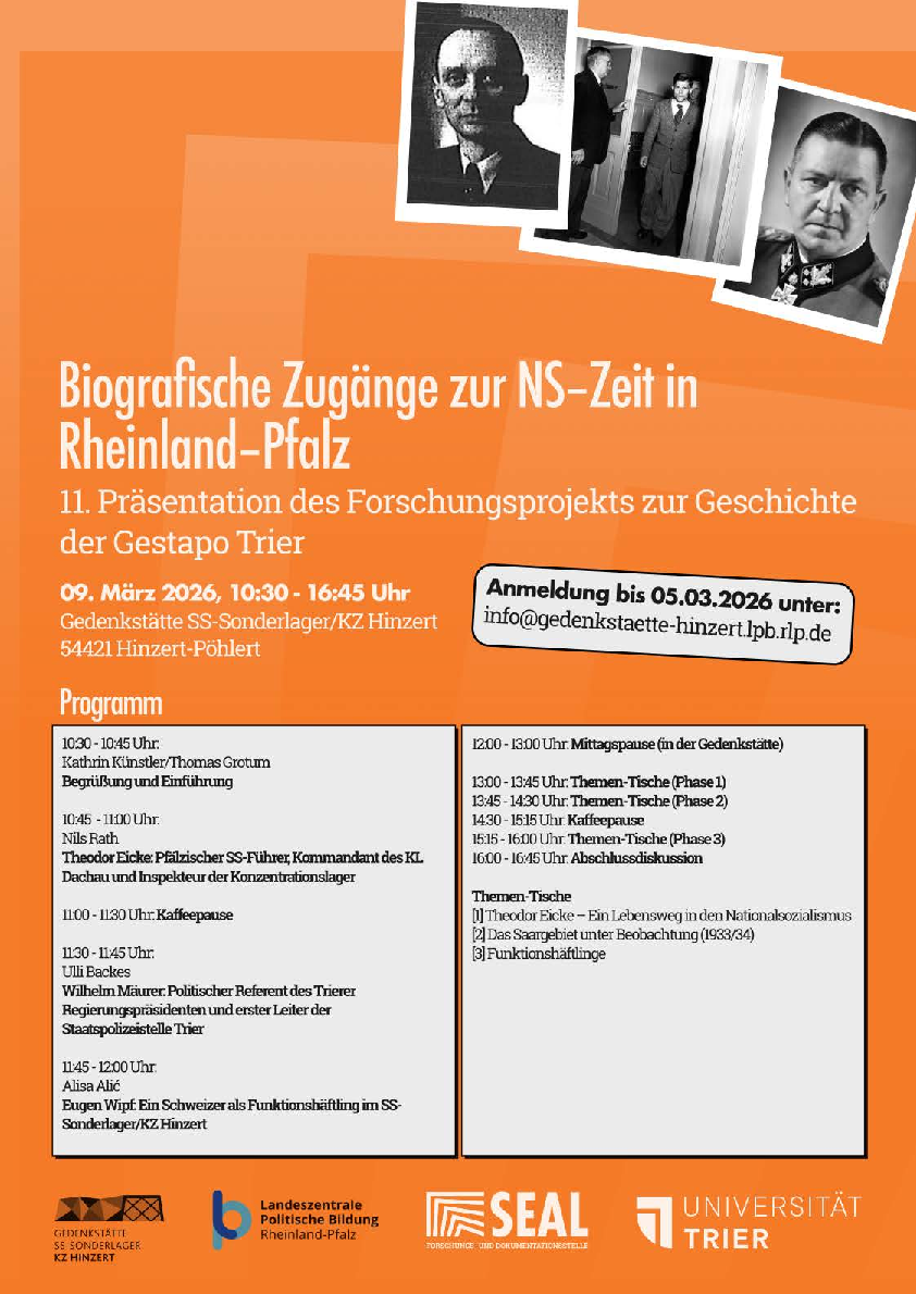 Unter dem Oberthema „Biografische Zugänge zur NS-Zeit in Rheinland-Pfalz“ werden Beiträge über Theodor Eicke (war vor 1933 in die Pirmasenser Bombenaffäre verwickelt), Wilhelm Mäurer (ehemals Leiter der Staatspolizeistelle Trier) und Eugen Wipf (ehemals Funktionshäftling im SS-Sonderlager/KZ Hinzert) vorgestellt. Nach der Mittagspause gibt es die Möglichkeit, die in den Vorträgen angesprochenen Schwerpunkte an Thementischen mit den Referenten zu vertiefen.